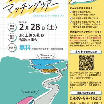 高知県中西部に位置し、人口は約6,000人。海・山・川と揃っており、高知がぎゅっとつまった魅力的な町です。初めて会う人に気軽にあいさつや話しかける気さくな町民の方も多く、温かい雰囲気と心地よい距離感の町の人々。田舎ながらも、スーパー・飲食店・温泉などもあり程よく田舎暮らしができます。 2025.12.04コラム 【移住者インタビュー】20代で地元に戻るって、実際どう? 中土佐町・大野見で働く23歳の本音 2025.12.02最新情報 「高知暮らしフェア冬」中土佐町も参加します! 2025.11.28お知らせ 【出展レポート】JOIN 移住・交流&地域おこしフェア2025に行ってきました! 2025.11.20お知らせ 【募集中!】空き家マッチングツアーを開催します! 中土佐町へ移住をお考えの方向けに、暮らしの情報をまとめました。 すまい しごと 子育て 移住体験 地域おこし協力隊 補助金 石山 佳那さん地域おこし協力隊2025年 Iターン 白方 幹大さん地域おこし協力隊2025年 Iターン 「移住って何から始めたらいいの?」 移住までの4つのステップにまとめました。ケース別の移住の流れもあわせてご覧ください。 中土佐町への移住に役立つ情報をまとめました。 移住体験住宅 オーダーメイド型 移住体験ツアー 空き家バンク 地域おこし協力隊 防災・災害対策 ふるさと ワーキングホリデー よくある質問