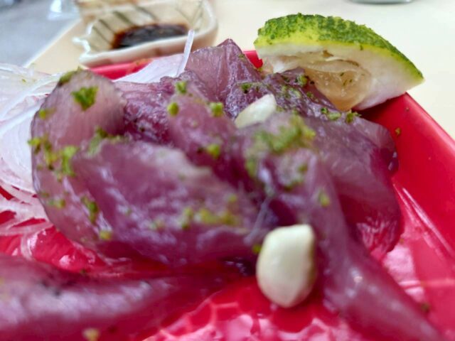 久礼地区、市場すぐ横、漁港目の前の「ど久礼もん」さんの加工場で、朝に市場で仕入れた土佐久礼かつおをその場で捌いてもらい、港でいただきました。