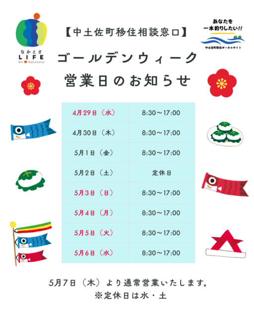 GW営業日のお知らせ ホーム > 最新情報 > お知らせ > GW営業日のお知らせ ゴールデンウィークが近づいてきました。 中土佐町移住相談窓口(なかとさLIFE)、の営業日のお知らせをさせていただきます! 詳しくは画像をご覧ください。 5/2(土)以外は営業しているので、久礼散歩の途中にでものぞいてくださいね。